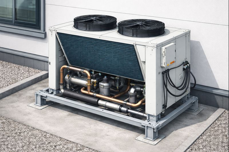 Чиллер представляет собой установку, предназначенную для охлаждения воды или других жидкостей. В системах кондиционирования используется совместно с фанкойлом. Выпускается в форме моноблока или с разделенными теплообменниками.